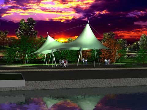 建筑環(huán)保節(jié)能:膜結(jié)構(gòu)建筑具有良好的環(huán)保性、透光性、自清潔性,膜材表面采用PVDF(聚偏二氟乙烯)涂層、或二氧化鈦涂層,具有較好的隔熱效果,對太陽熱能可反射掉70%,膜材本身吸收了17%,傳熱13%,而透光率卻在20%以上,經(jīng)過長期太陽光直接照射,其輝度仍能保留70%。